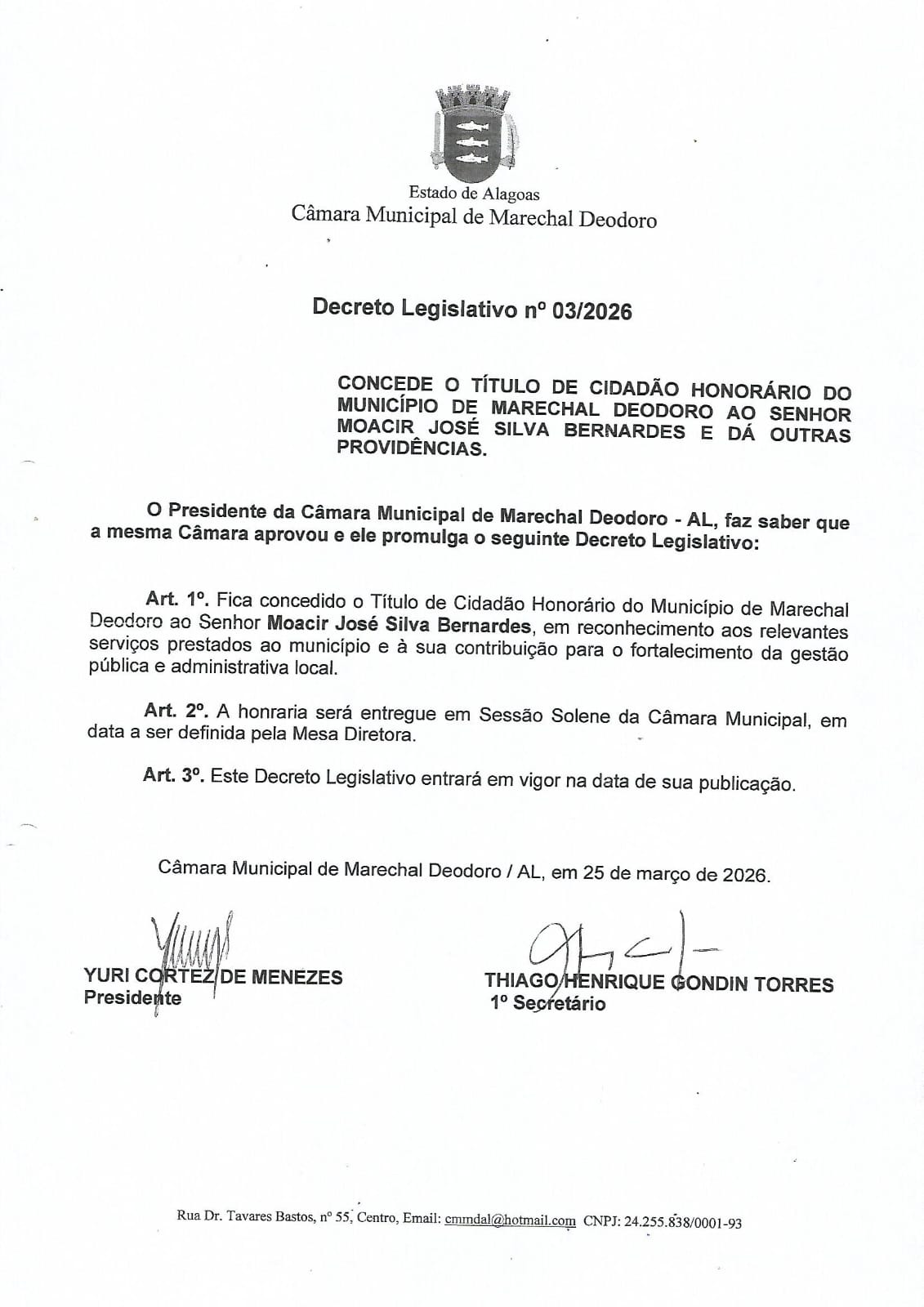 CONCEDE O TITÚLO DE CIDADÃO HONORÁRIO DO MUNICÍPIO DE MARECHAL DEODORO AO SENHOR MOACIR JOSÉ BERNARDES E DÁ OUTRAS PROVIDÊNCIAS.